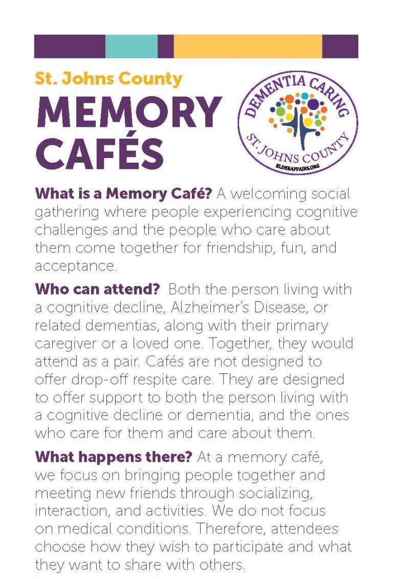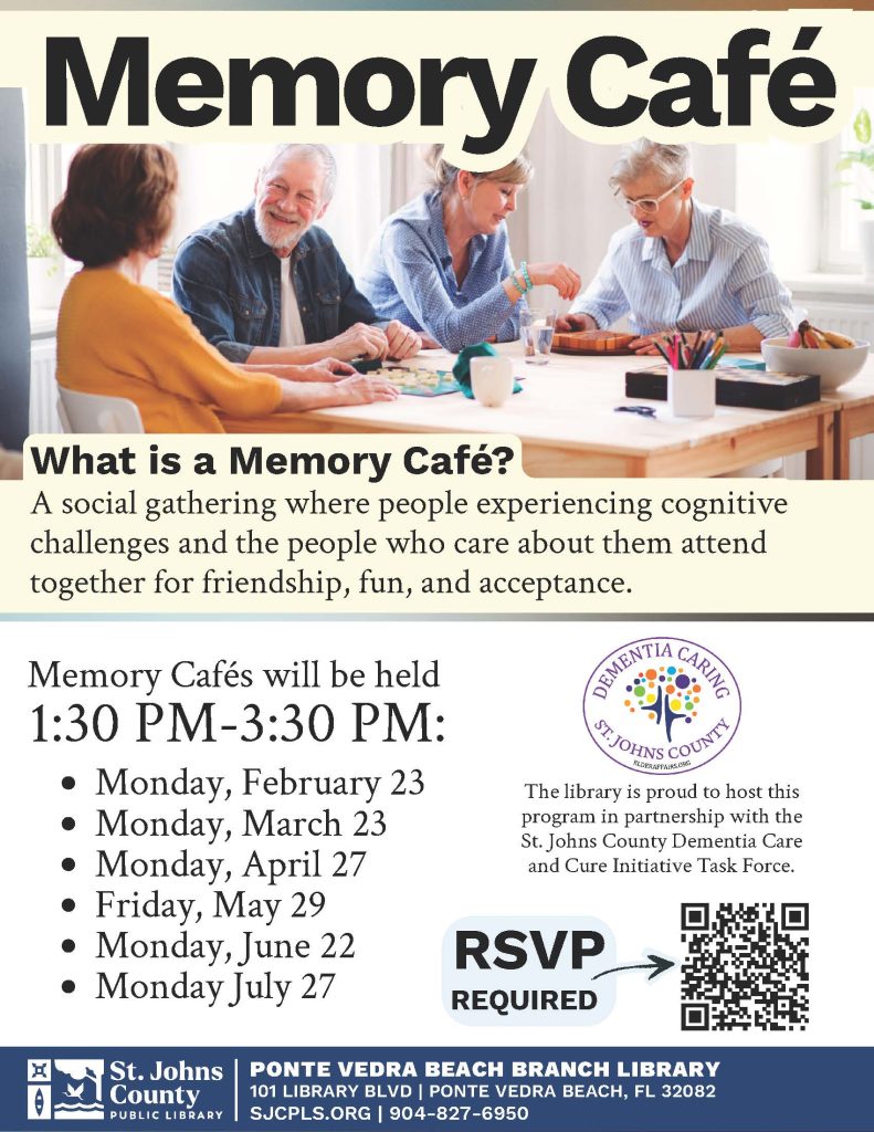The DCCI Task Force will be hosting Memory Cafés in 2026 at the following locations in St. Johns County, FL: