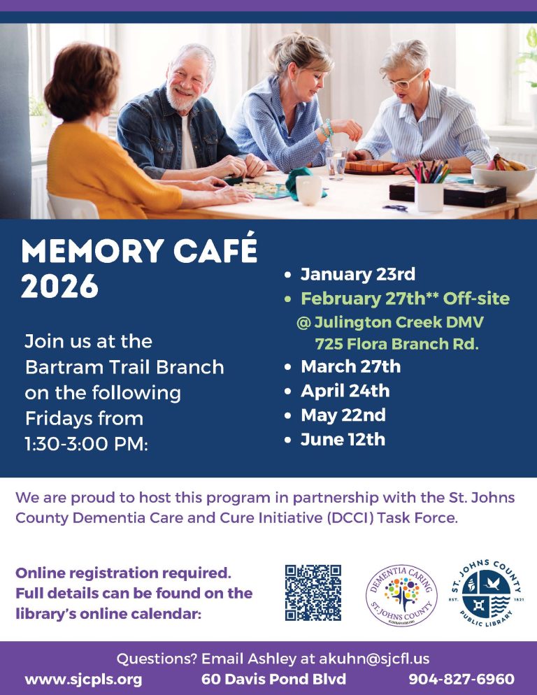 St. Johns County Bartram Trail Branch Library, 60 Davis Pond Blvd., Fruit Cove, FL 32259, from 1:30 pm – 3:00 pm, on the following dates: January 23, February 27 (off-site at Julington Creek DMV, 725 Flora Branch Rd.), March 27, April 24, May 22, and June 12, 2026. To register for this location, please click here, or call (904) 827-6960.